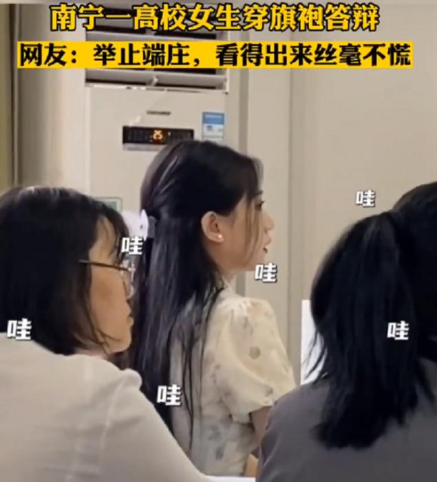 南寧某高校的一位女大學(xué)生,答辯教室里一身清新的旗袍裝扮,真的是美不勝收,舉止落落大方,仿佛穿越的大家閨秀,美的叫人挪不開(kāi)眼。